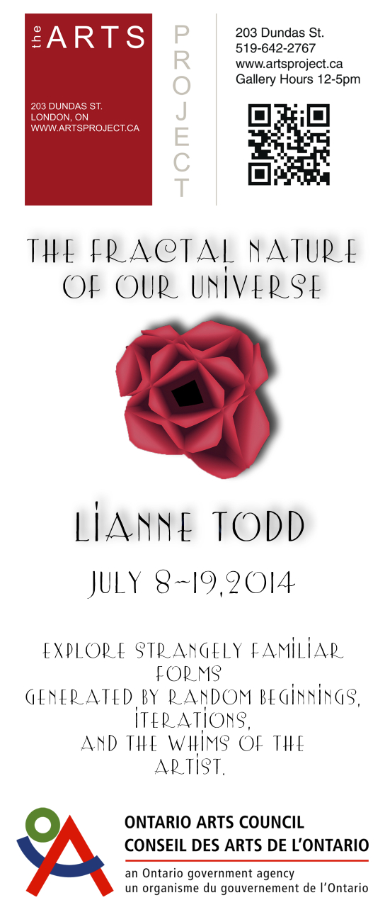 Some other tools I have employed to make my art are the software which I use to generate the fractals I start with. I have primarily used Spangfract XTel, and Oxidizer, on my iMac. These programs provide me with infinite possibilities and I thank them for that! My frames and many of my other art supplies were purchased at Guthrie’s Art Supplies & Framing, of London – mainly because they also provide excellent service and reasonable prices – and Olga knows me when I walk in. Richard and Sandra, at The ARTS Project, were very helpful with advice and equipment for hanging yesterday. Finally, I would like to acknowledge the funding support from the Ontario Arts Council, an agency of the Government of Ontario.